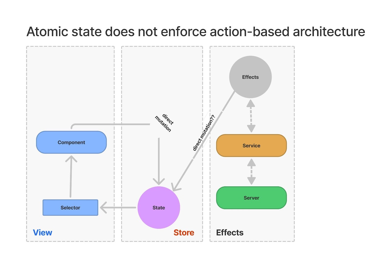 Our model is inspired by libraries including Jotai or Recoil but with a crucial layer of control, because atomic state is endlessly flexible with minimum-possible cognitive overhead, but lacks any opinionated pattern for controlling state changes in the context of user actions and external effects – as in the diagram below, we see that out-of-the-box atomic state management directly mutates individual state atoms without any choreography:
