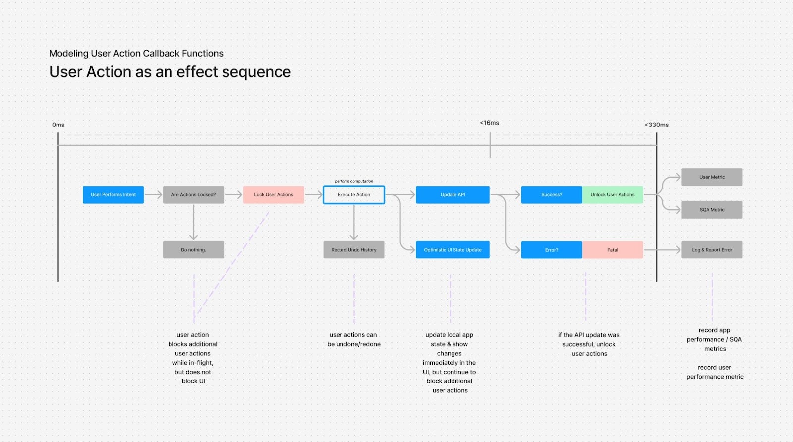 This entire complex flow is encapsulated into a simple reusable higher-order-function pattern (as in a reusable React hook that we call usePerformAndRecordActionCallback), making it easy and intuitive for our feature developers to use this powerful pattern correctly and safely.
